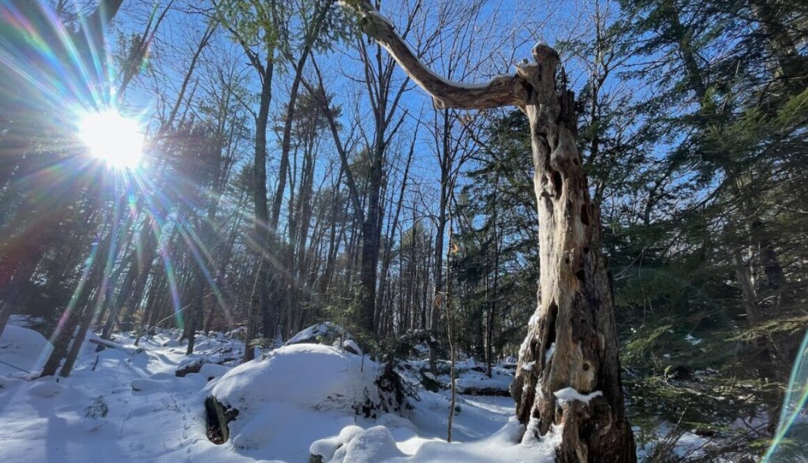After we passed the Swamp trail we started to climb a bit until we reached the height of land on our trip. Up there, there were a series of houses and a nice stone wall that the trail followed. At this point we were the only ones who have been on the snowy trail.