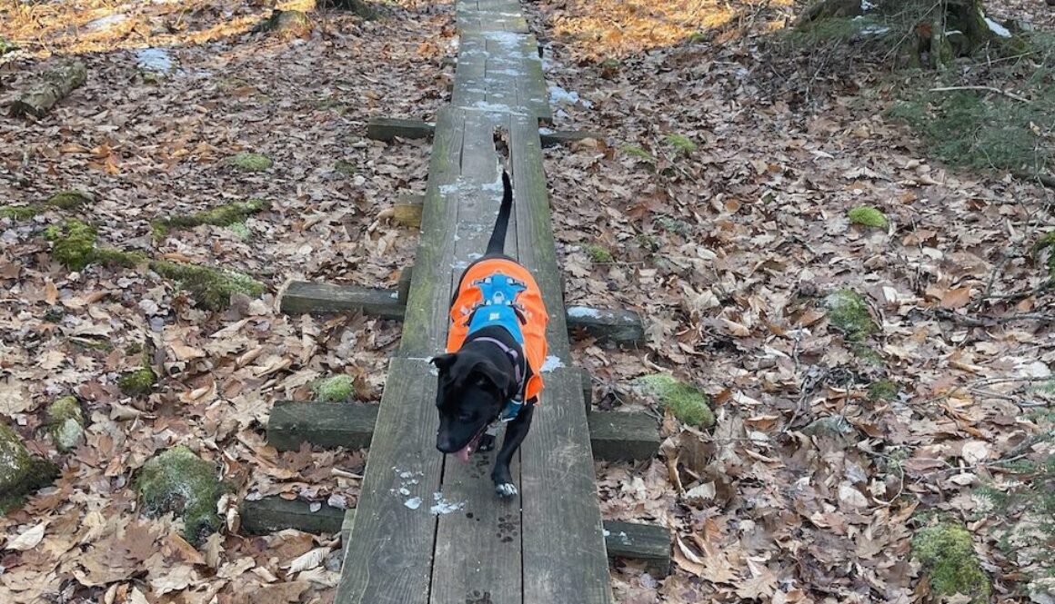 The trail follows a brook, hence the name, and Liberty enjoyed playing in the water despite the cold temps. There are a few large boulders and some rock formations to see as well.