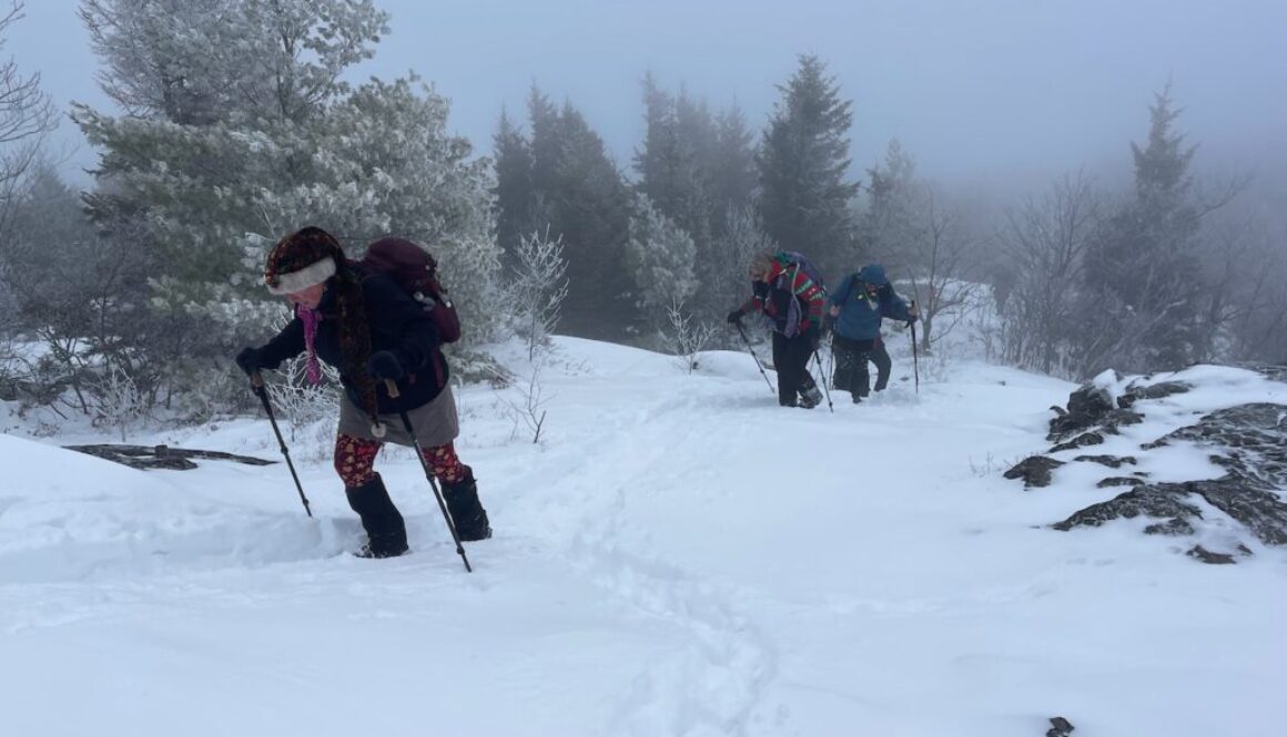 We headed out toward the trail head and started marching. Some wore snowshoes but most wore microspikes. At the bottom the snow was ok. The trail was well trampled and would really get packed down with all these people.